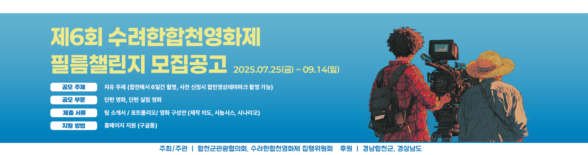 이번 합천영화제는 영화제 기간 중에 단편 영화를 완성하는 ‘챌린지’ 형식으로 진행되어 재능 있는 신진 영화인의 창의적이고 독창적인 작품을 발굴예정입니다.